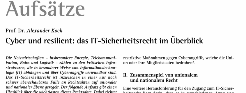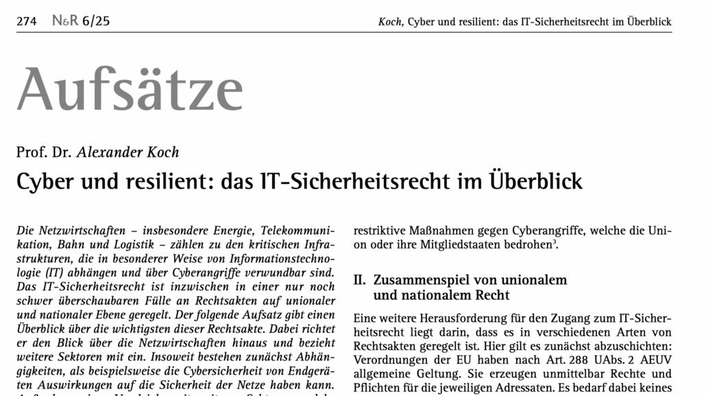 In der aktuellen Ausgabe der N&R 2025, 274 ist ein Aufsatz von mir mit dem Titel „Cyber und resilient: das IT-Sicherheitsrecht im Überblick“ erschienen.