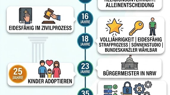 Bundeskanzler:in kann man mit 18 werden, Bürgermeister:in in NRW mit 23, Bundesbeauftragte:r für den Datenschutz und Informationsfreiheit erst mit 35 und mit einem Job als Bundesverfassungsrichter:in oder als Bundespräsident:in muss man bis 40 warten;