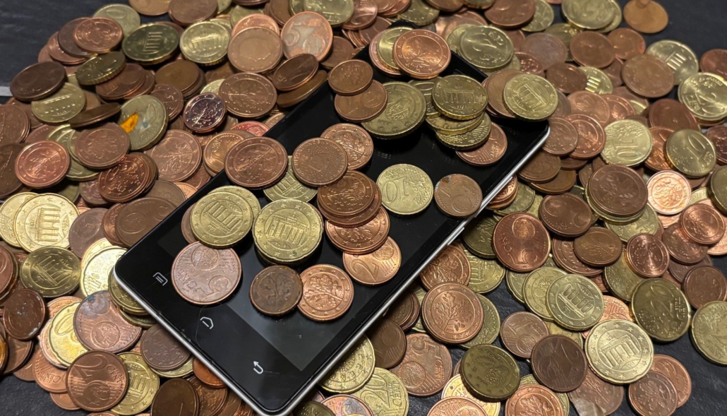 Mobiltelefon in einem Haufen Münzen liegend.